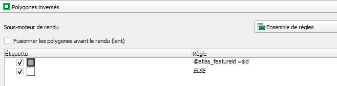 Pour qu’un masque soit automatiquement généré sur l’objet actif de l’atlas, il faut alors paramétrer la symbologie de la couche de l’atlas (ici, les arrondissements) comme ensemble de règle comme ci-contre: